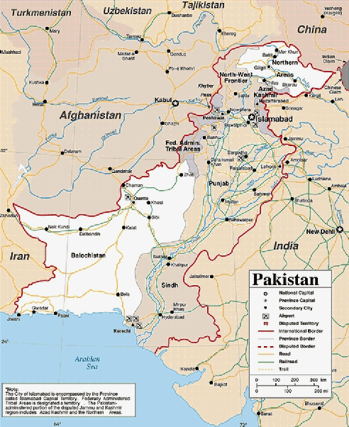 South Asia, bordering the Arabian Sea, between India on the east and Iran and Afghanistan on the west and China in the north  (Pakistan is located between 32o-42' and 36o-55' North latitudes and 60o-45' and 75o-20' East longitudes