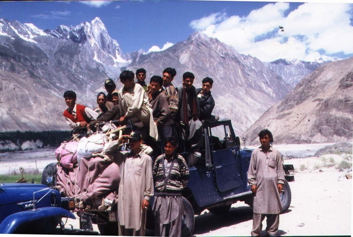 Balti porters proceeding by jeep to Akoli (3050M), the last village where trek starts to Baltoro Camping on Batura Trek in Hunza Valley A lake in the Glacier on Biafo-Hispar Trek The Karambar Lake in the Hindu-kuch region